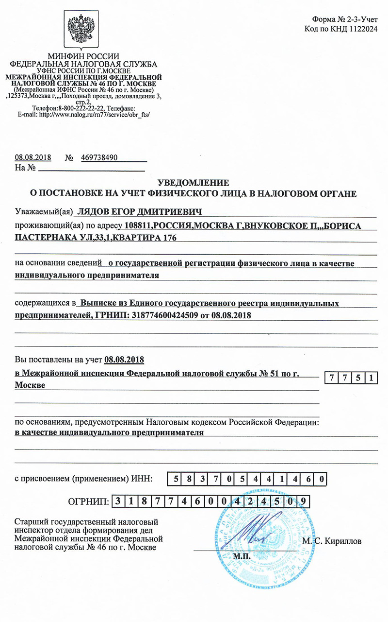 ИНН 583705441460 / ОГРНИП 318774600424509